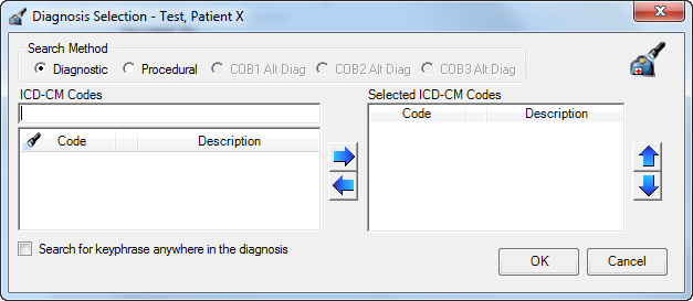 Note: Select the Search for keyphrase anywhere in the diagnosis check box to list codes that have the entered search criteria anywhere in the code (if searching by code) or in the description (if searching by description).
