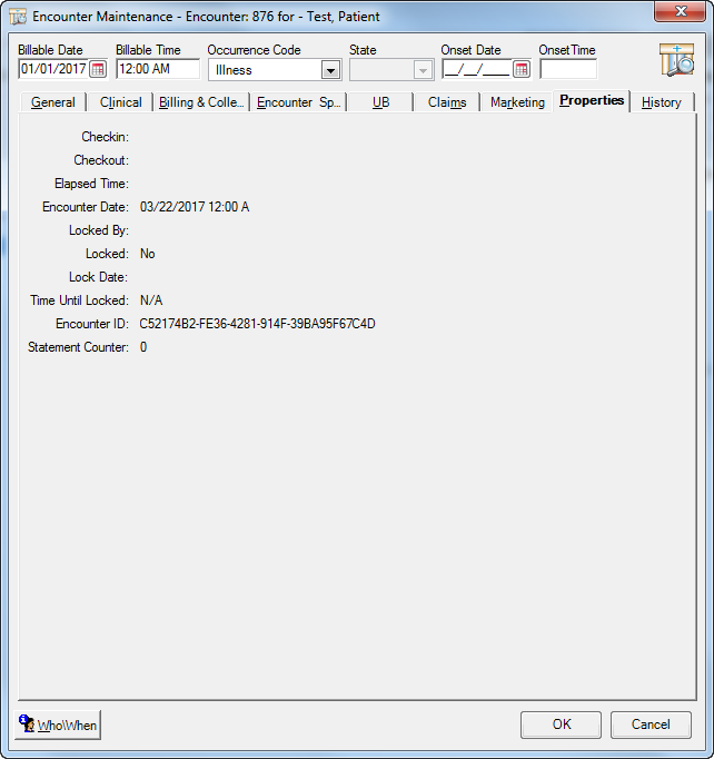 The Properties tab displays additional information about the encounter, but the fields that display this information cannot be edited.