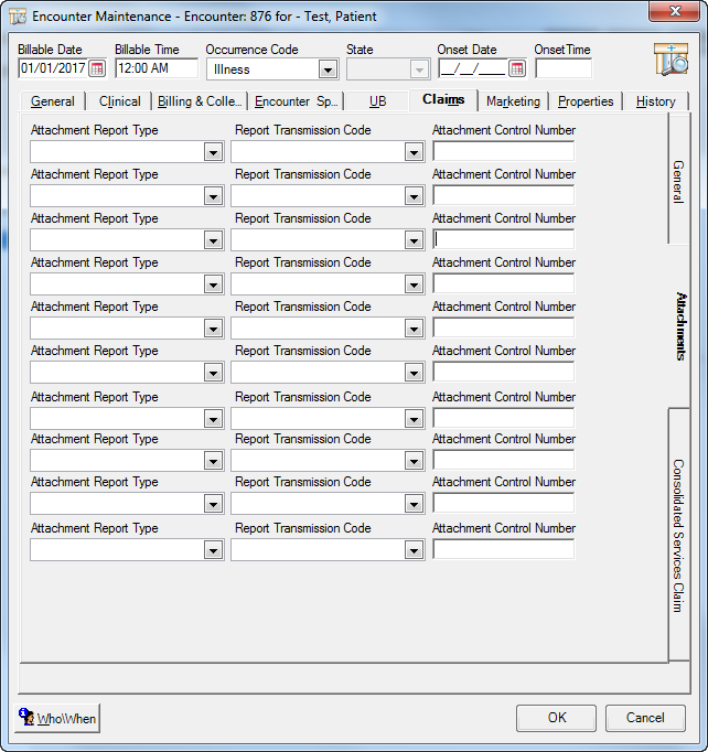 - Attachment Report Type: Select the type of claim attachment associated with the encounter. The selected option populates PWK01. The available options are: