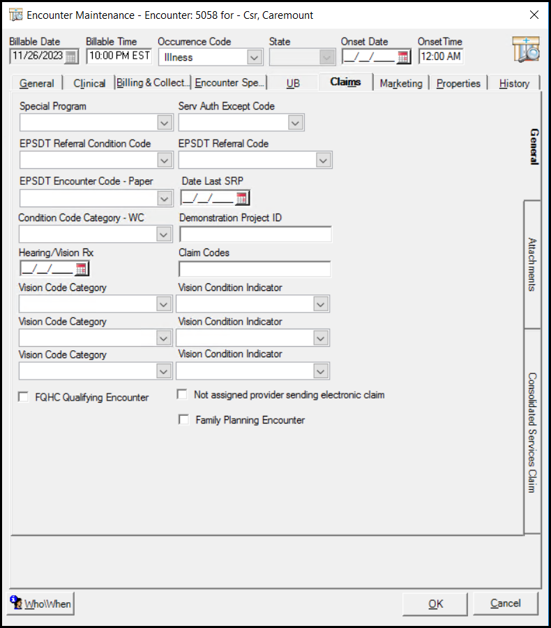 | Claim Codes | Enter a free-text claim code for the encounter, if applicable. |