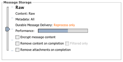 One limitation on message throughput is the amount of disk writes that Mirth® Connect's database must perform while processing each message. Reducing the amount of message data retained can increase throughput and decreases memory usage as well as disk usage. Production level guarantees that if an unexpected server failure occurs, any incomplete (received, but not yet fully processed) messages will be automatically recovered and processed on restart. If increased performance is needed, you can to reduce this to the Raw level, which only retains the original raw message prior to being processed by any transformer steps. Incomplete messages can still be recovered on failure, but must be done so by manually reprocessing them. Keep in mind that using destination queues requires at least Production level.