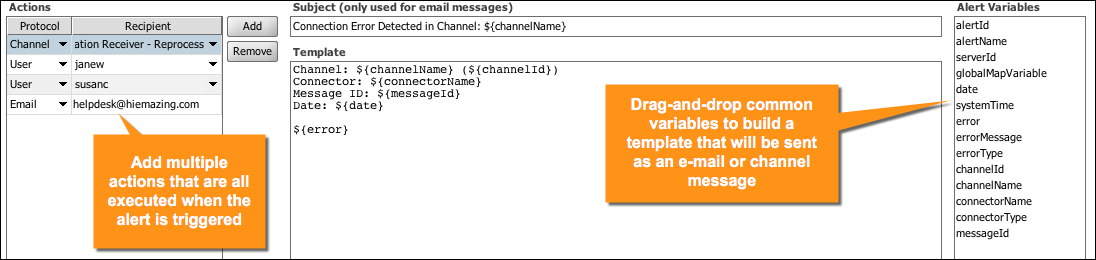 - Channel: The template is sent as a message to the channel selected in the Recipient column. The subject is not used for this protocol.
