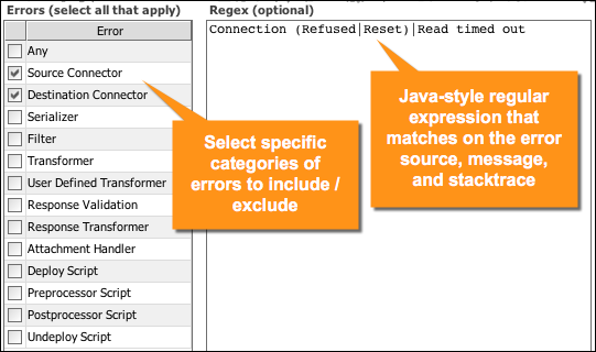 This section of the Edit Alert View allows you to decide what type of errors you want your alert to trigger on. This includes choosing among categories of error types, and optionally using a regular expression that only allows events whose error source, error message, or exception stacktrace matches to cause an alert trigger to occur.