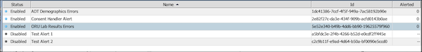 This is the main section of the Alerts View that shows the current status and action counters for all of your configured alerts. For general information about working with tables in Mirth Connect, see, Working With Tables.
