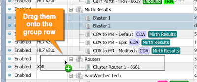 To move channels to a specific group, select the channel rows in the table and drag them onto the group row: