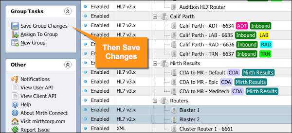 The following context-specific tasks for channel groups are available from the Channels View. Task Icon Task Name Description Save Group Changes Saves all changes made to channel groups and refreshes the Channels view. Assign To Group Moves the selected channel(s) into a specific group. New Group Creates a new channel group and adds it to the table. The user is prompted for the group name and description as described in the Edit Group Details task. This task appears after the channels view fully loads. Edit Group Details Allows the user to edit the group name and description. This can also be accessed by double-clicking the group row. For additional information, see Edit Group Details. Import Group Imports a channel group from an XML file. For additional information, see Import Group. Export All Groups Exports all channel groups in the table to their respective XML files. For additional information, see Export Group. Export Group Exports the selected channel group(s) to their respectiv