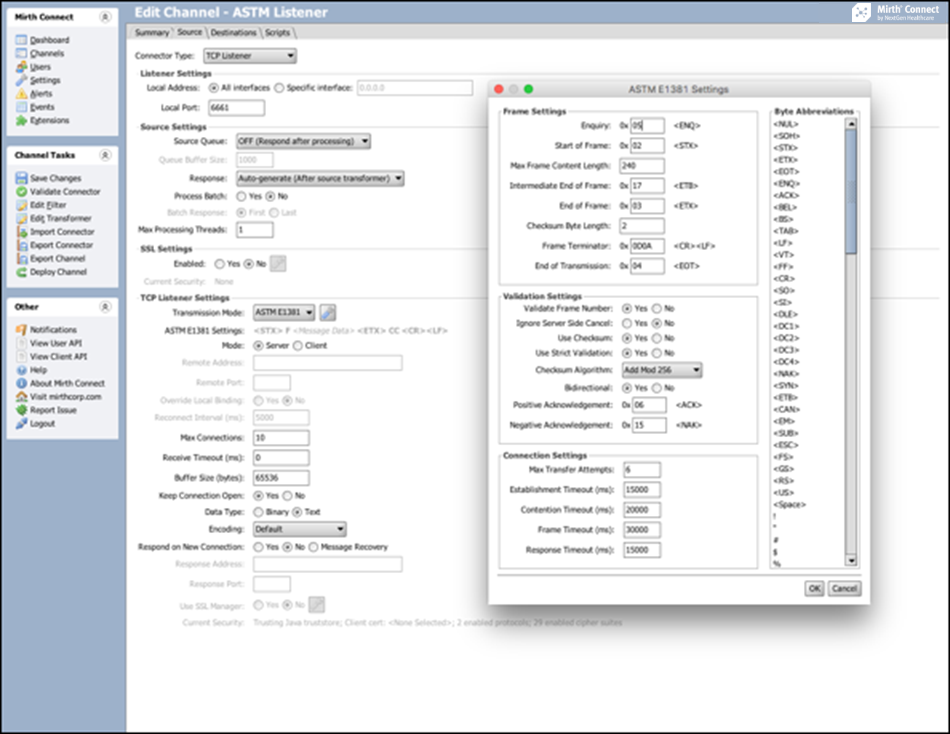 The ASTM E1381 transmission mode for Mirth® Connect enables you to send and receive data using the ASTM E1381 lower-layer protocol standard. It can be used in conjunction with the TCP Listener / TCP Sender or the Serial Connector. By default the official ASTM E1381 standard is strictly followed, but there are several settings available to support variations from the standard. The extension supports specifying the bytes used for frame delimiters, the checksum algorithm used, various timeouts, and much more. Contact Us if you have any questions.