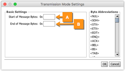 This transmission mode allows you to specify basic TCP frame data (beginning and ending byte sequences). This allows the source connector to know when a message has been fully received. Destination connectors also use these sequences when sending data outbound.