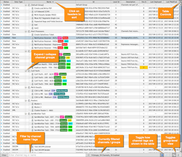 This is the main section of the Channels view that shows the status and metadata for your currently configured channels. For general information about working with tables in Mirth Connect, see Working With Tables.