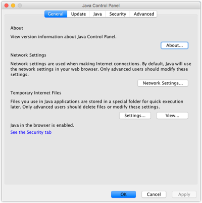 - In your System Preferences (on OSX) or the Control Panel (on Windows), open the Java section. A new dialog will appear: