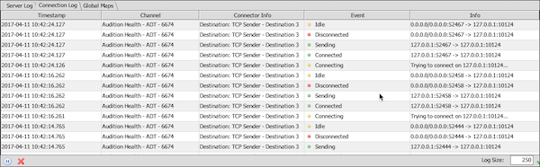 The Connection Log is a detailed view of events that occur as messages flow through your channels. When a message is received or sent out, various events get logged here. It is an ephemeral log, so it is kept in memory only and not written to a file anywhere.