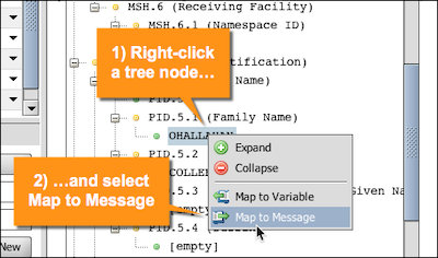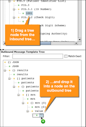 Drag the node you wish to map from the inbound message tree, and drop it into the node you wish to map to in the outbound message tree.