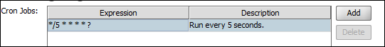 This schedule type gives you full control to enable advanced, nuanced polling schedules using Cron-like expressions. Select the Add / Delete buttons to add or remove entries from the table. The expressions must abide by the following format: