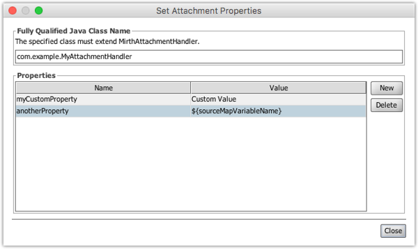 This attachment handler gives you full control over the attachment extraction process by allowing you to provide a custom Java implementation of MirthAttachmentHandlerProvider. In the properties you specify the class name, and any properties you want to pass in.