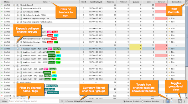 This is the main section of the dashboard. The Dashboard Table shows the current status and statistics for your deployed channels. For general information about working with tables in Mirth® Connect, see Working With Tables.