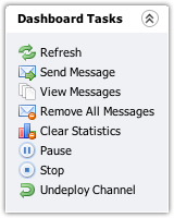 Undeploy Channel | Removes the channel from the list of deployed channels. Once undeployed, the channel will no longer appear on the dashboard, and instead will only be visible from the Channels view. When undeploying, the channel will first be gracefully stopped, and any currently processing messages will first be finished. Note that the Channel Dependencies workflow may apply to this task. |