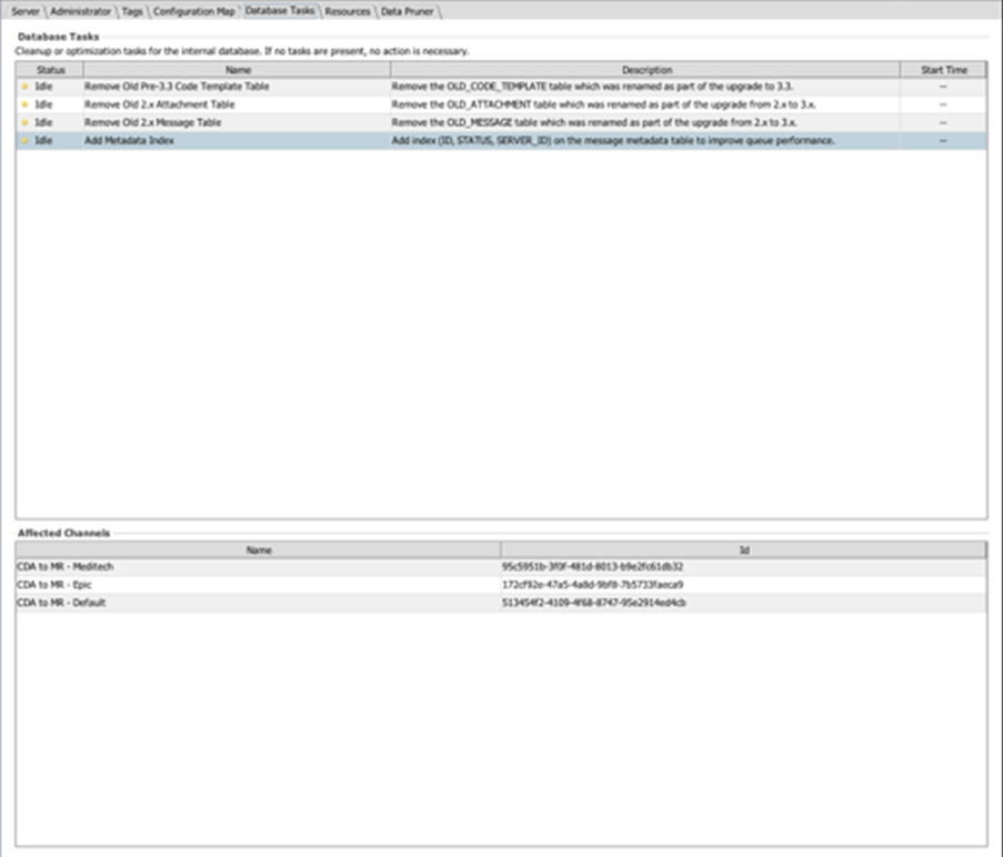 The Database Tasks Settings tab shows you all cleanup or optimization tasks for the internal Mirth® Connect database.