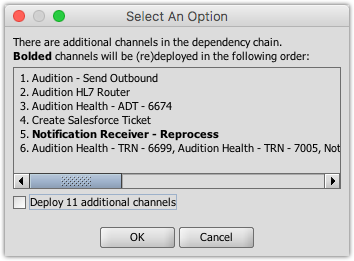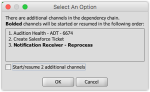 When you start a channel, the Mirth® Connect Administrator automatically checks if there are any dependencies of the channel that should be started first. If there are, they will be shown in a special dialog: