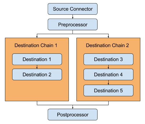 In the above example, there are 5 total destinations. However Destination 3 does not wait on Destination 2, so it marks the beginning of a new chain. If each destination takes 1 second to process, then the overall time it takes the message to process through the channel will not be 5 seconds, but rather 3 seconds. When flowing through the destination connectors, a message will take only as long as the longest destination chain.