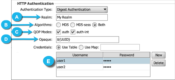 D | Opaque | A string of data that should be returned by the client unchanged. Velocity Variable Replacement is supported in this field. The default value, ${UUID}, means that a randomly generated universally unique identifier will be sent back on each digest challenge. |