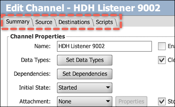 The Edit Channel view is where channels are configured. General settings and other properties not specific to a connector are configured on the Summary Tab. Connector-specific settings are configured on the Source and Destinations tabs. Channel-level scripts not specific to connectors are configured on the Scripts Tab.