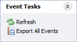 Export All Events | Exports all events to a file in the Application Data Directory. For additional information, see Export All Events |