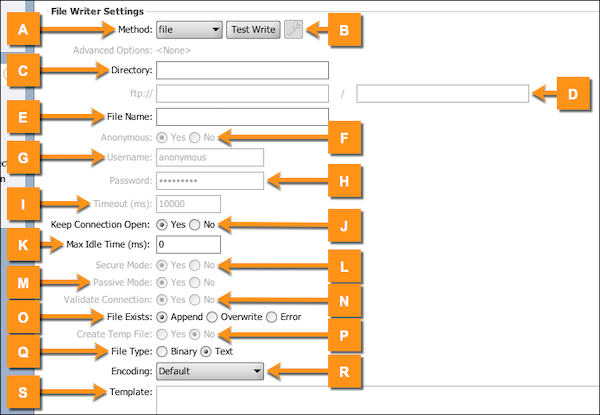 A | Method | file | The basic method used to access the directory to write files to. Options include File (local filesystem or NFS / mapped share), FTP, SFTP, SMB, WebDAV, or Amazon S3. Once all necessary connection/directory information has been filled in before, use the Test Write button to attempt to actually connect and test the ability to write to the directory. |