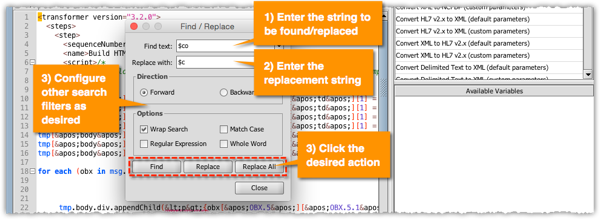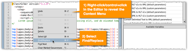Note:Mirth® Connect performs the selected action and highlights the strings in the Editor.