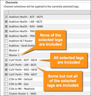 If a check box in the table shows a grey box, it means that you have multiple tags selected in the tags table and the channel in question is included on only some of the selected tags.