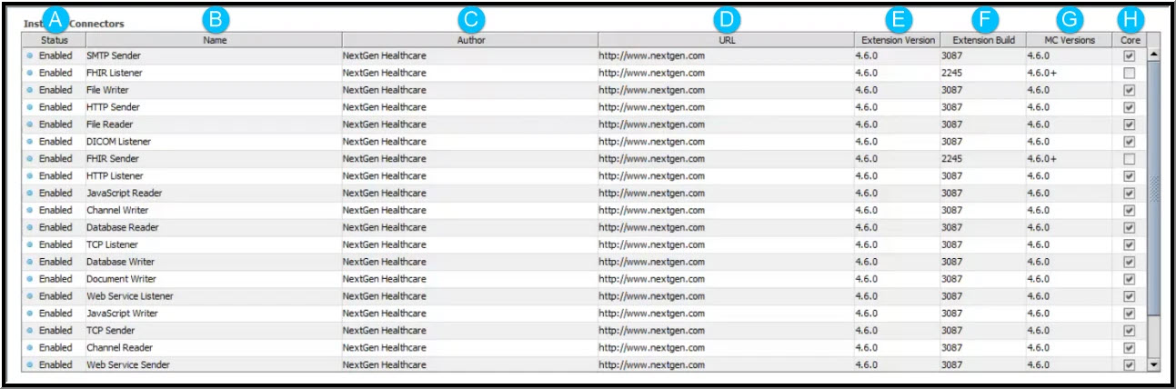 H | Core | Indicates whether this extension is a "core" extension that comes bundled with Mirth® Connect by default. |