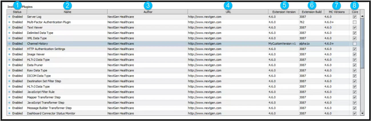 8 | Core | Indicates whether this extension is a "core" extension that comes bundled with Mirth® Connect by default. |