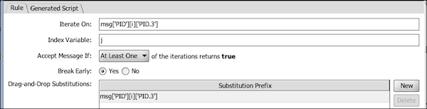 Drag-and-Drop Substitutions | When drag-and-dropping values into the children underneath this Iterator, the index variable (e.g. "[i]") will be injected after any of these prefixes. For example if your index variable is i and you have msg['PID'] in the Drag-and-Drop Substitutions table, when you drag the value msg['PID']['PID.3']['PID.3.1'].toString() from the Message Trees Tab into a child rule, it will automatically be replaced with msg['PID'][i]['PID.3']['PID.3.1'].toString(). |