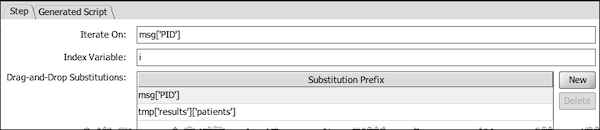 Drag-and-Drop Substitutions | When drag-and-dropping values into the children underneath this Iterator, the index variable (e.g. "[i]") will be injected after any of these prefixes. For example if your index variable is i and you have msg['PID'] in the Drag-and-Drop Substitutions table, when you drag the value msg['PID']['PID.3']['PID.3.1'].toString() from the Message Trees Tab into a child step, it will automatically be replaced with msg['PID'][i]['PID.3']['PID.3.1'].toString(). |