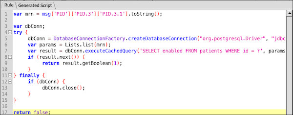 This rule allows you to write a completely custom script to decide whether to filter the message or not. For more information about using JavaScript, see Using JavaScript in Mirth Connect.