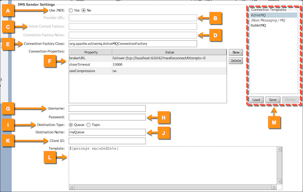 M | Connection Templates | This section allows you to save the current state of your JMS Sender properties into a template, which may then be restored later if you make changes, or may also be applied to other JMS Sender connectors. More information here: JMS Listener |