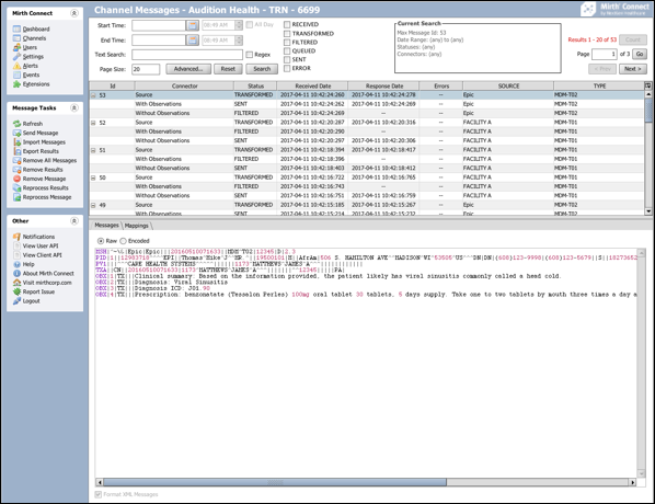 The Message Browser allows you to view and search historical and actively processing messages for your channels. It also has options for importing, exporting, removing, and reprocessing messages.