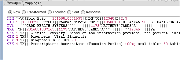The Messages tab in the Message Browser shows the actual content of the message at various states as it processed through the selected connector message.
