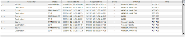 Messages are organized by ID, and multiple rows for each connector message appear in the table, depending on your search criteria.