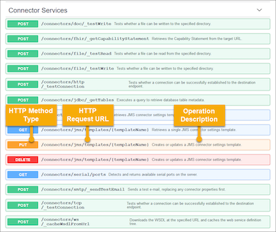 - Select the arrow button on one of the endpoint group rows to view its operations. This list shows the operation's HTTP method type, request URL, and a description for each endpoint.