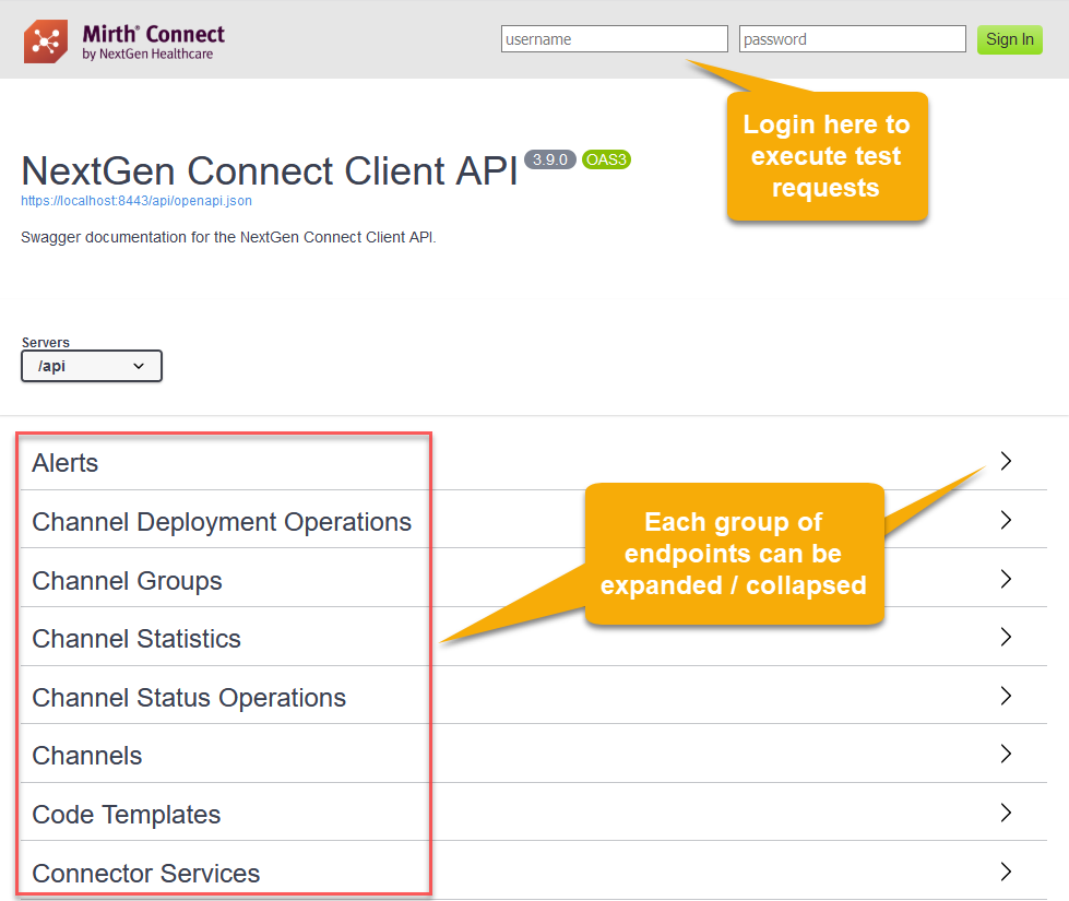 The Administrator and Command Line Interface both use a well-defined API to communicate with the Mirth® Connect server. You can also use the same API to create custom integrations of your own. The API is documented at https://localhost:8443/api (change the IP / port as needed), or you can select View Client API in Administrator via Other Tasks: