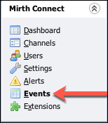 This table shows metadata (ID, timestamp, operation name) about each event that has been stored by the server. The Page Size option dictates the number of events shown in the table simultaneously (for additional information, see Searching Events) . When you first enter the Event Browser, by default the latest 100 events appear. For general information about working with tables in Mirth® Connect, see Working With Tables. Metadata Table Columns PHI Events Parent topic: Events View
