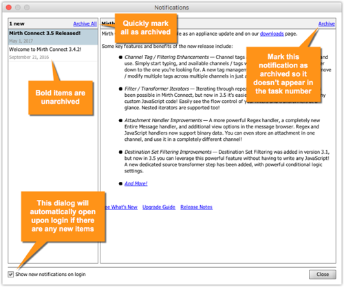 This dialog shows all messages you have received from Mirth® Connect headquarters. This allows you to be notified when a new version of Mirth® Connect is available, or for other news.