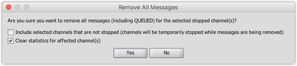 - You may only Remove All Messages for channels that are currently stopped. If you select a channel that is not stopped and remove all messages without checking this check box, nothing will happen. When this option is checked, any channels not currently stopped will be stopped prior to removing the messages. After the removal finishes, the channels automatically start back up.