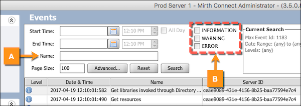 B | Level | Check these boxes to search for events with the INFORMATION, WARNING, and/or ERROR levels. |