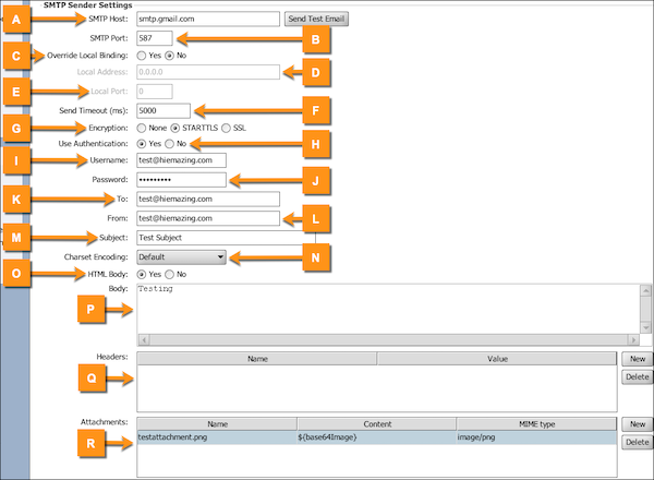 A | SMTP Host | The domain name or IP address of the SMTP server to use to send the e-mail messages. Note that sending e-mail to an SMTP server that is not expecting it may result in the IP of the machine running Mirth® Connect being added to the server's "denylist". After filling out the necessary information below, use the Send Test Email button to send a sample e-mail to the To address, to verify that everything is working as intended. | |