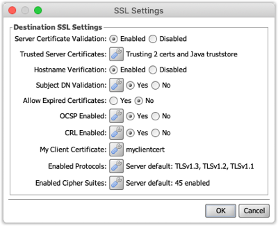 - Hostname Validation: If enabled, validation will fail if the Subject CN (or Subject Alternative Name) presented in the server certificate does not match the actual endpoint the connector is dispatching to. If disabled, valid certificates will be accepted even if the host name does not match.