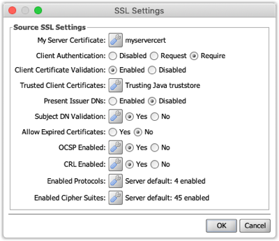 - Subject DN Validation: This is only applicable when Client Authentication is used. If enabled, only client certificates with subject distinguished names (DNs) matching the given list will be allowed. If a client certificate not matching any of the trusted DNs is presented, the SSL connection / handshake will fail.