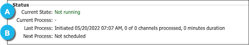 Current Process: Identifies the start time of the currently executing pruning job, the number of channels that have been processed, and how long the job has been running.