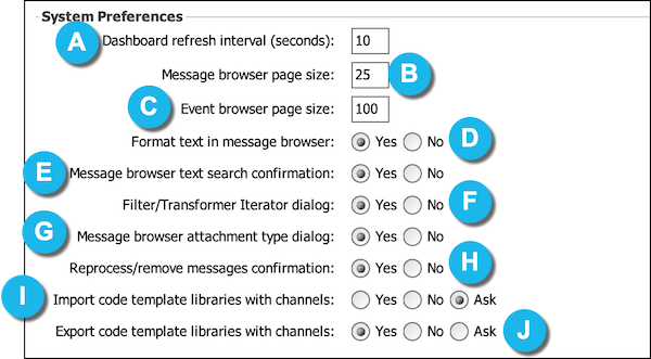 System Preferences options enables you to customize system behaviors for the Mirth Connect Administrator.