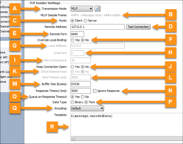 J | Keep Connection Open | No | Select Yes to keep the connection to the host open across multiple messages. Select No to immediately close the connection to the host after sending each message. Only applicable when Client mode is used above. |